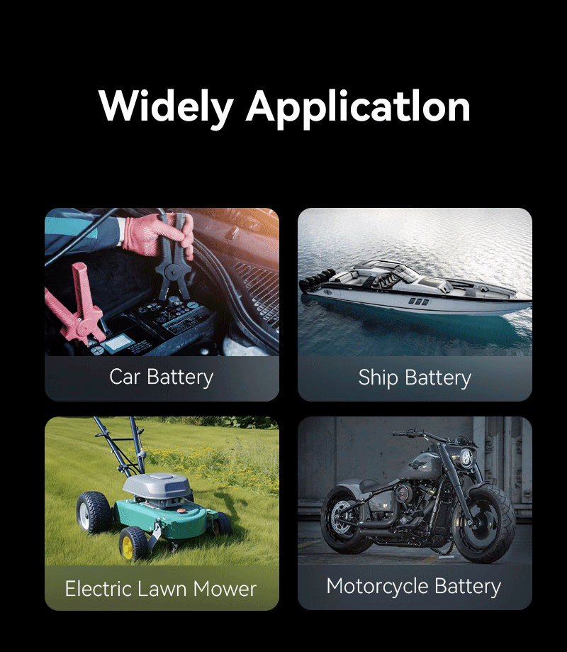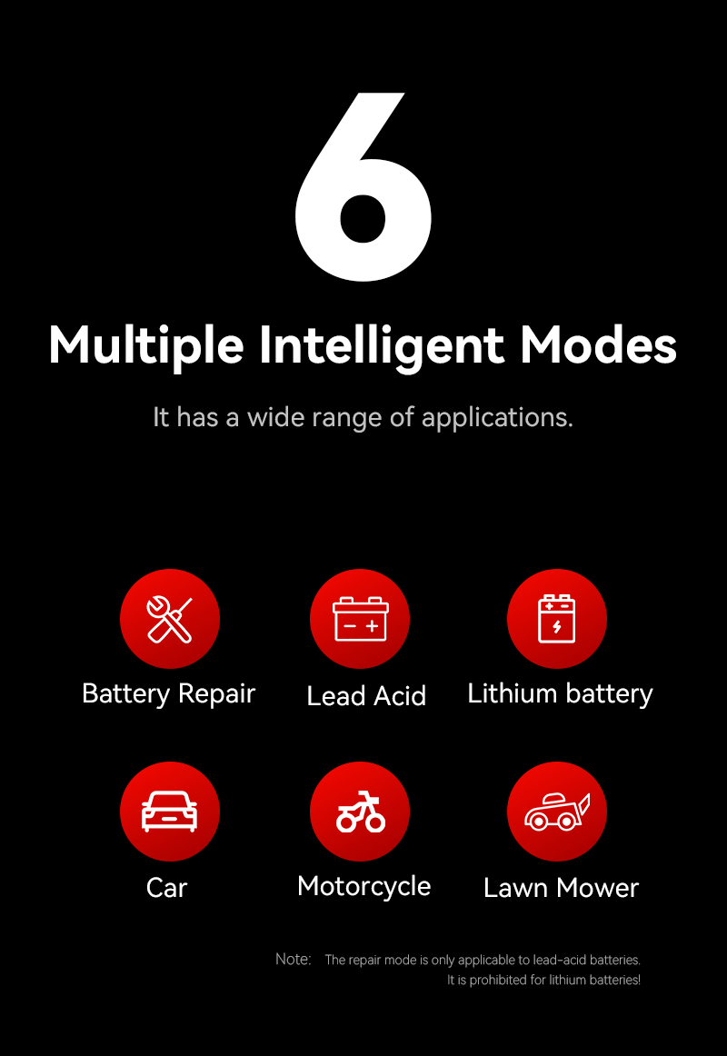 ●One-Button repair mode charging: Use high and low frequency pulses to repair power drained batteries.(Only applicable to 12V lead-acid batteries, 6V and 12V lithium iron batteries are unavailable)