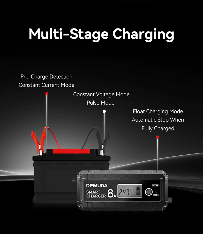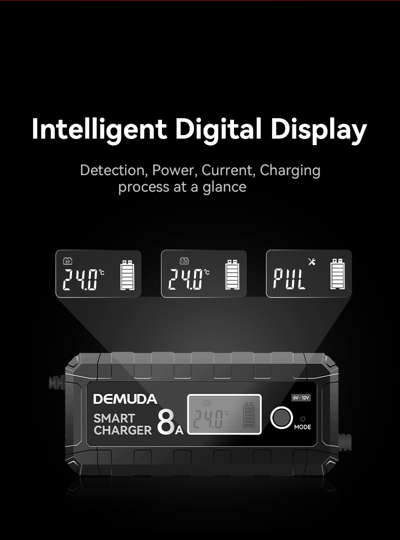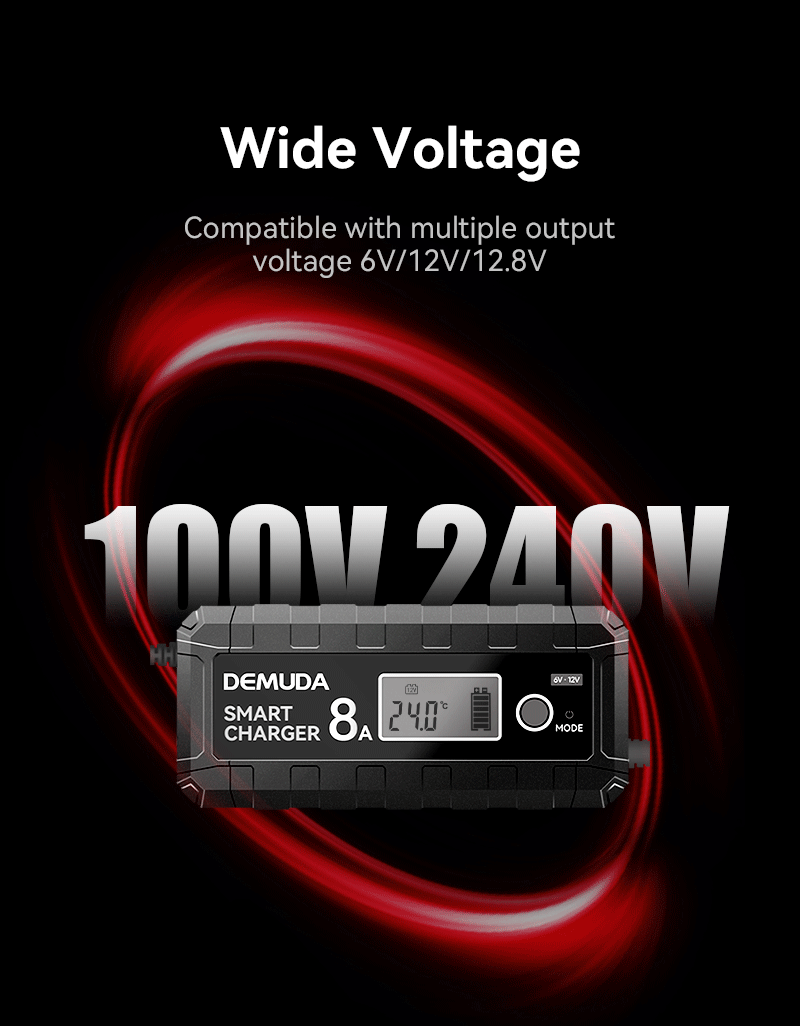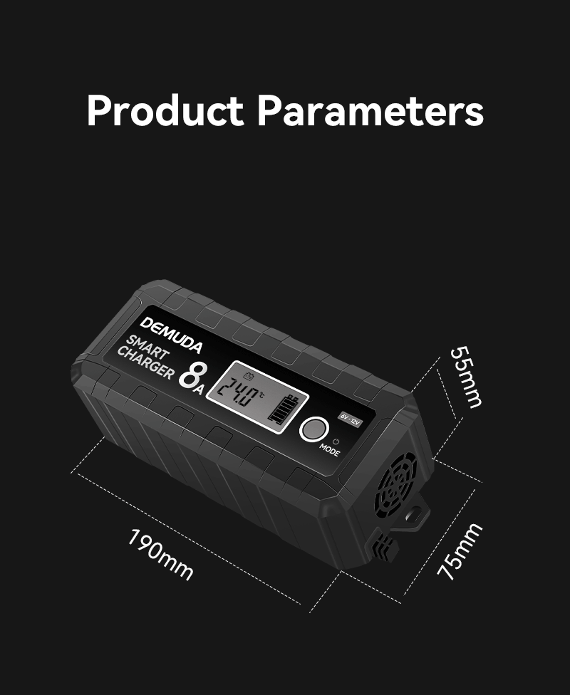 This 6V/12V/12.8V, 8Amp smart battery charger is suitable for multiple battery specifications and can flexibly cope with charging scenarios of different devices. Its size is exquisitely designed for easy storage and carrying. As a smart charger, it can automatically adjust the charging mode according to the battery type and status, and efficiently complete the charging process. At the same time, it has a reliable safety protection mechanism to provide stable protection for battery charging, whether it is daily maintenance or emergency charging, it can meet the use needs.