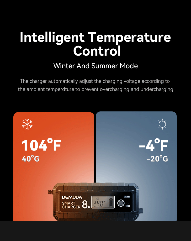 ●Winter and summer mode: The charger automatically detects the ambient temperature and enters the corresponding mode to ensure that it is sufficient in winter and not overcharged in summer.
