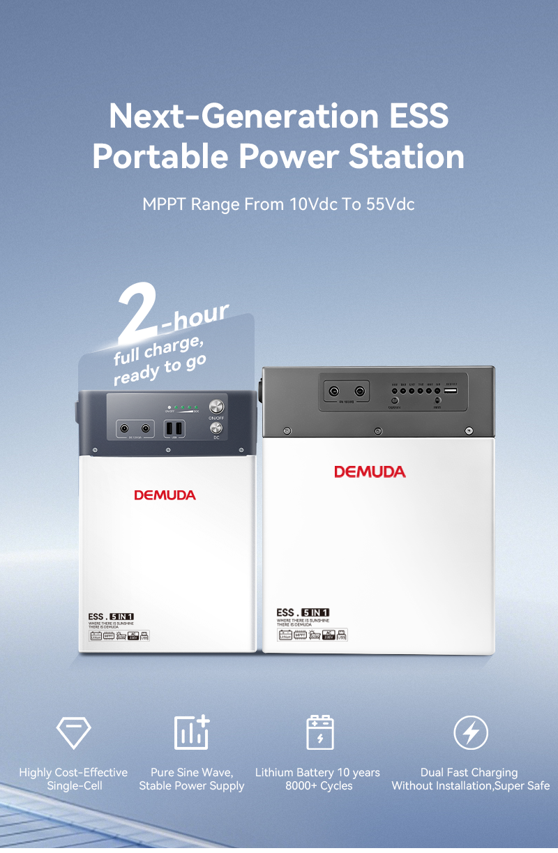 DEMUDA 300W solar portable energy storage power station adopts lithium iron phosphate batteries with a cycle life of 8000 times. It supports multiple charging methods such as solar energy and mains power, and outputs 100V/220V AC power. It is compatible with multiple country plugs and suitable for indoor and outdoor emergency power supply. It has multiple safety protections. The factory has 20 years of experience in new energy production and supports OEM/ODM customization, with a good reputation.