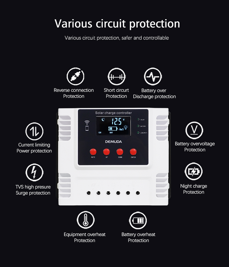 KDY is a PWM type solar charging controller with multiple rated currents ranging from 10A-60A. It is compatible with 12V/24V/48V automatic switching systems and supports lead-acid, ternary lithium, and lithium iron phosphate batteries. Equipped with WiFi APP remote control function (only supports Android), it can view and set work status at any time, and is easy to operate with an LCD display screen. Equipped with dual USB 5V/2A outputs, suitable for various off grid solar energy system scenarios such as home, industrial, camping RV, yacht, etc. The product has passed ROHS, CE and other certifications, with design patents and a one-year warranty. It has stable performance and is widely applicable in various scenarios.