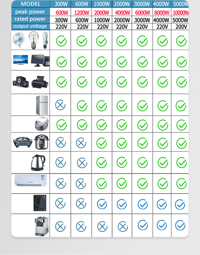 | Model | 300W | 500W | 600W | 1000W | 1500W | 2000W | 3000W |