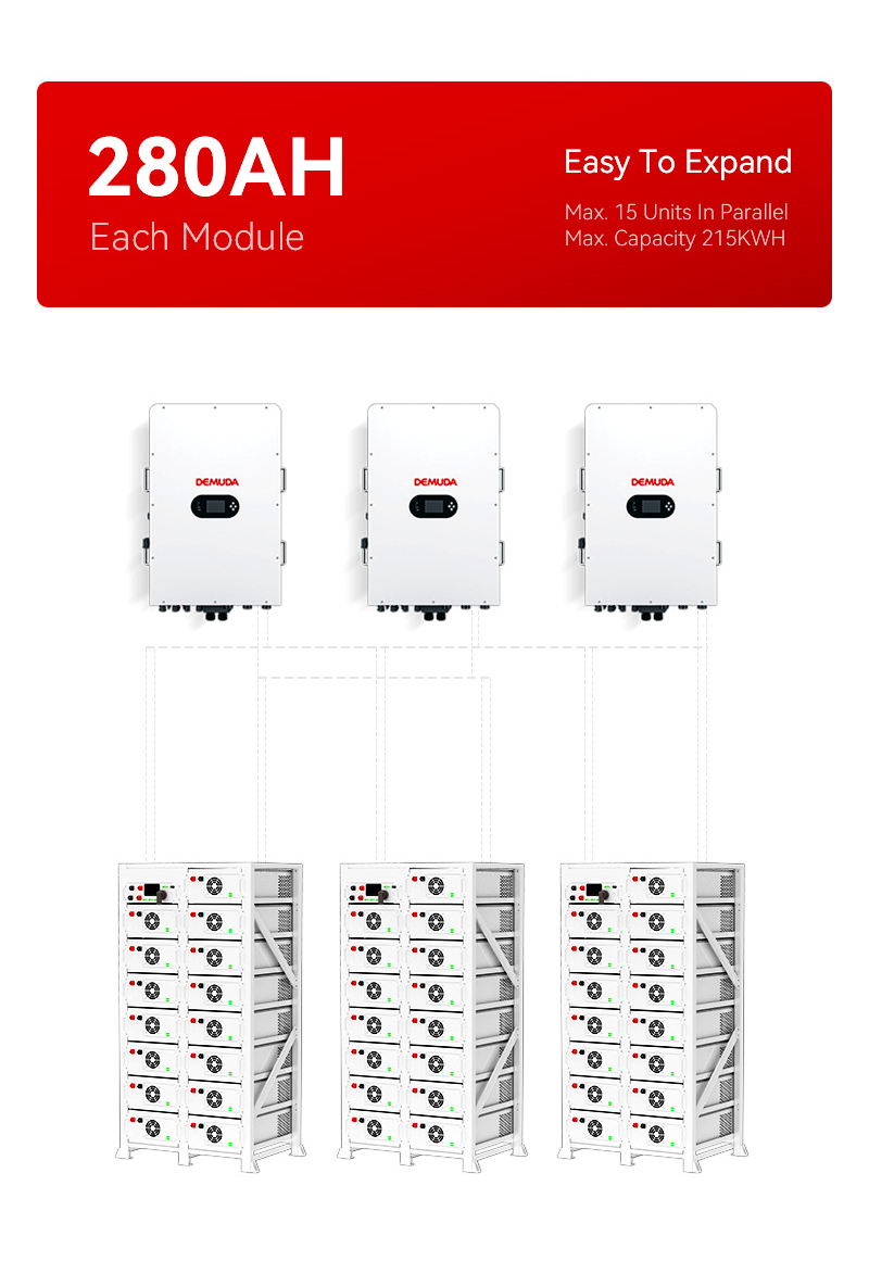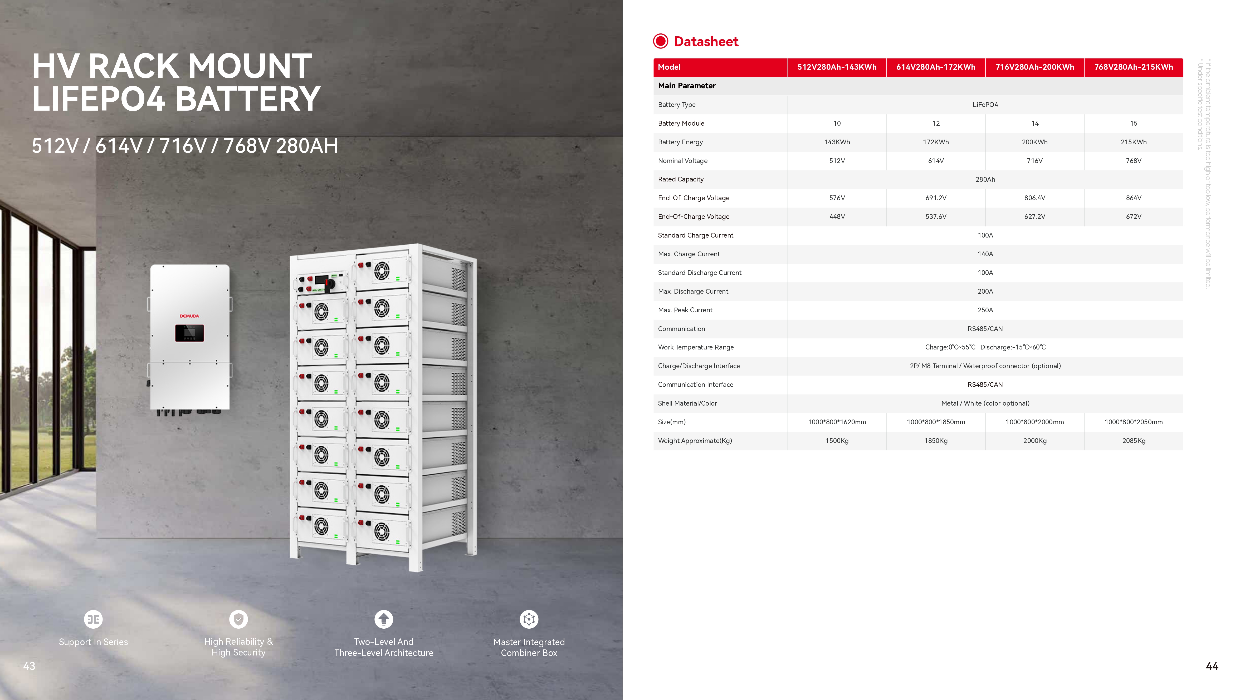 | Model | 512V280Ah-143KWh | 614V280Ah-172KWh | 716V280Ah-200KWh | 768V280Ah-215KWh |