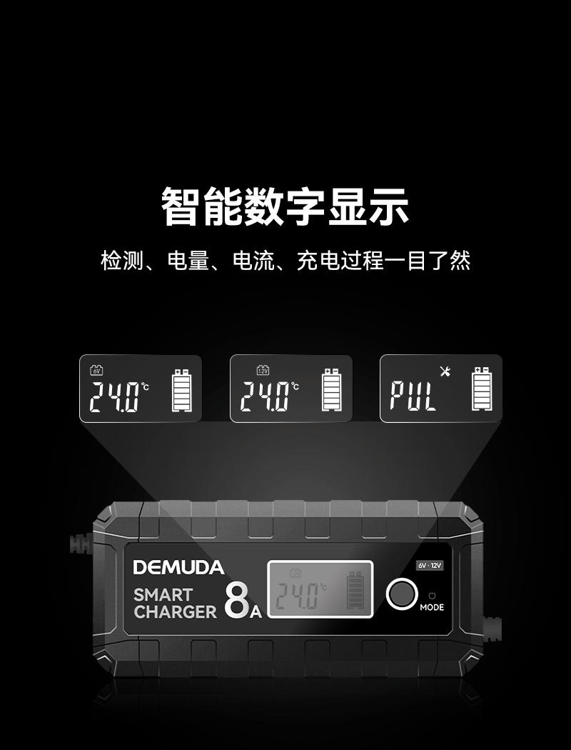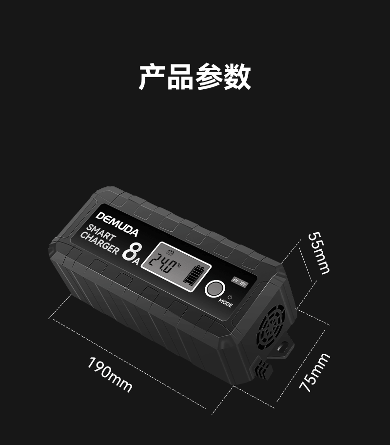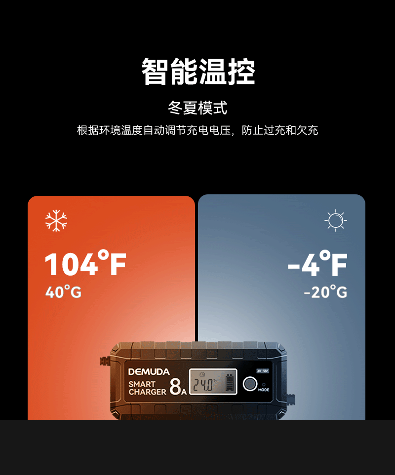 ●冬夏模式:充电器自动检测环境温度,进入相应模式,保证冬季电量充足,夏季不过充。