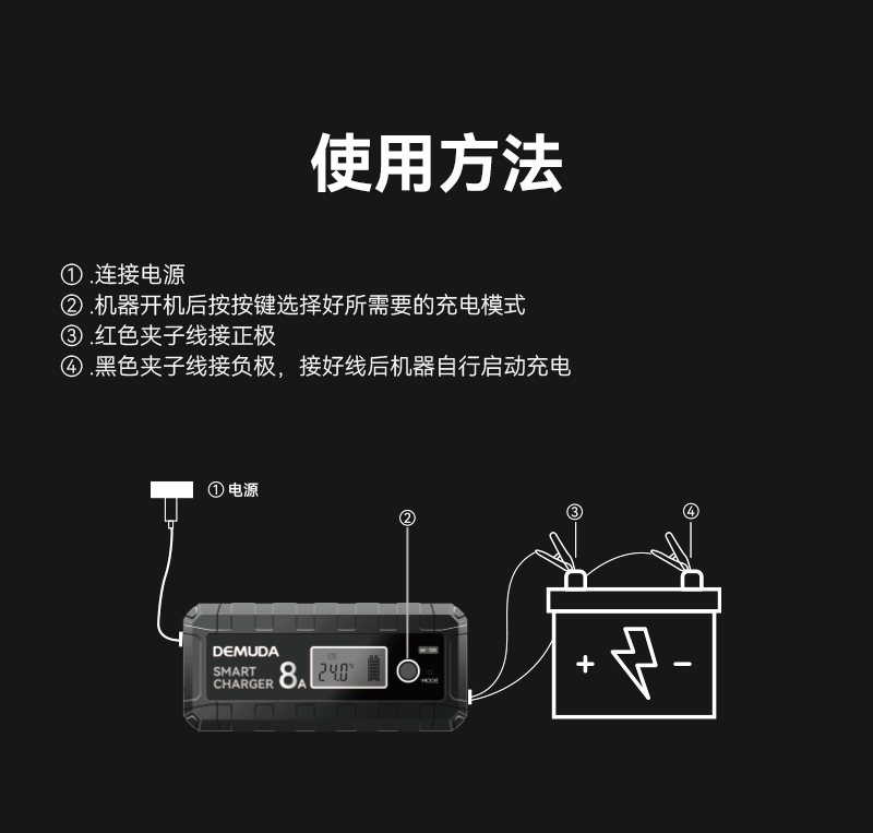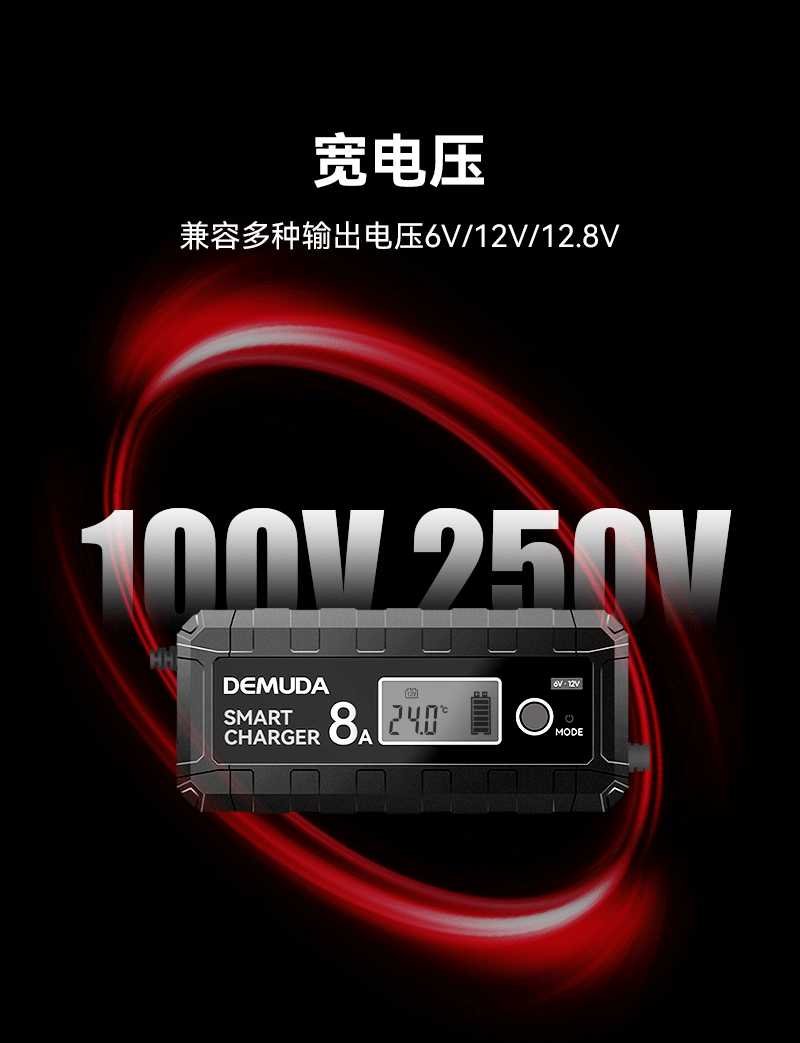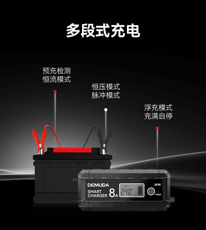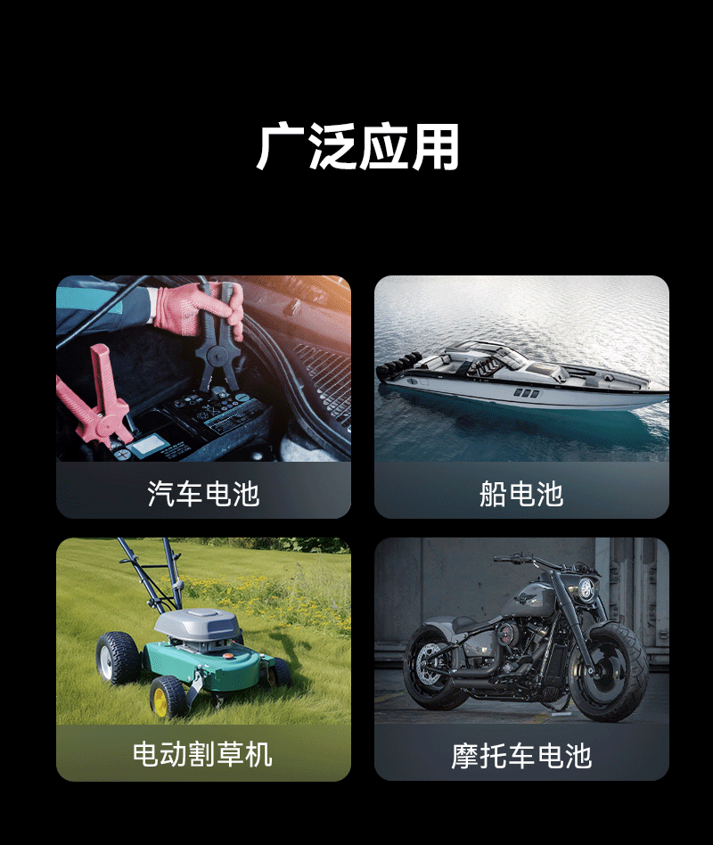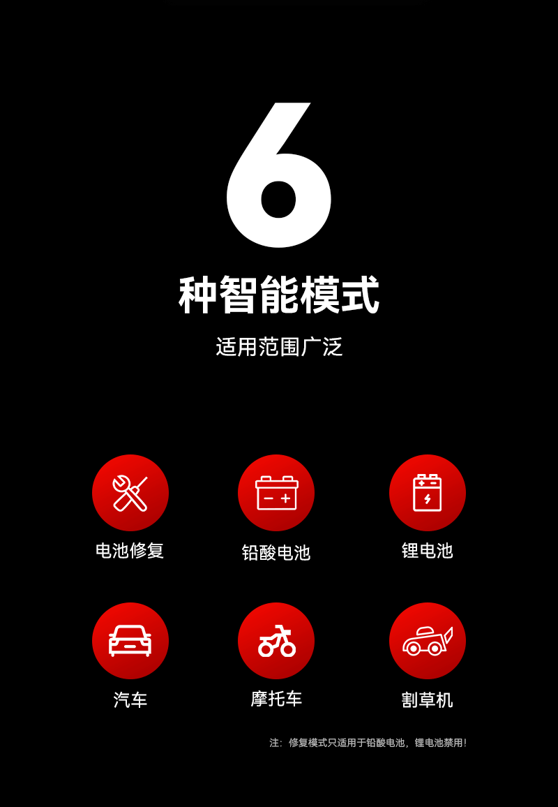 ●一键修复模式充电:采用高低频脉冲修复电量耗尽的电池。(仅适用于12V铅酸电池,6V和12V锂电池不可用)