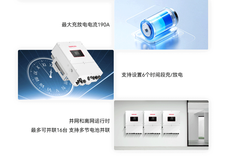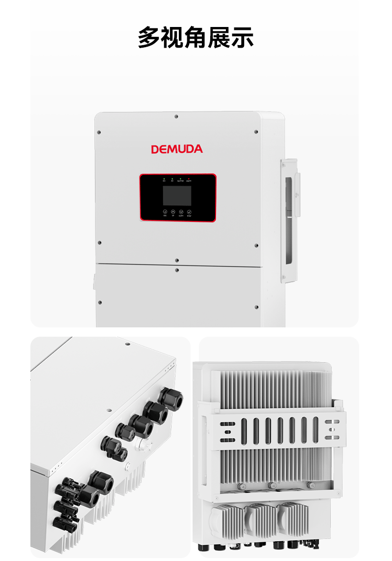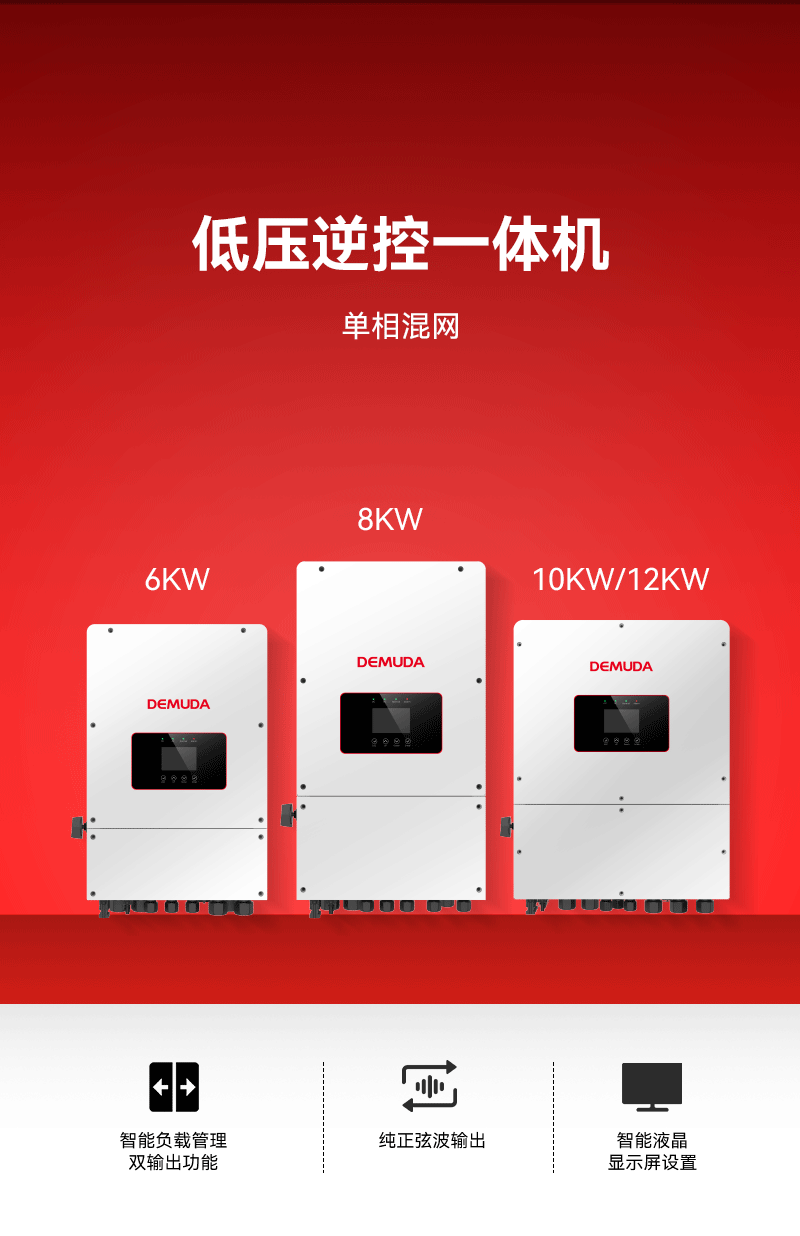 DEMUDA低压单相逆控一体机,提供6kW至12kW的功率,提供高发电量,支持多个并联连接,并支持各种电池类型以满足不同的电力需求。这些装置经过认证,并提供5年或10年保修,有助于高效利用光伏能源。(太阳能逆变器工厂直供)