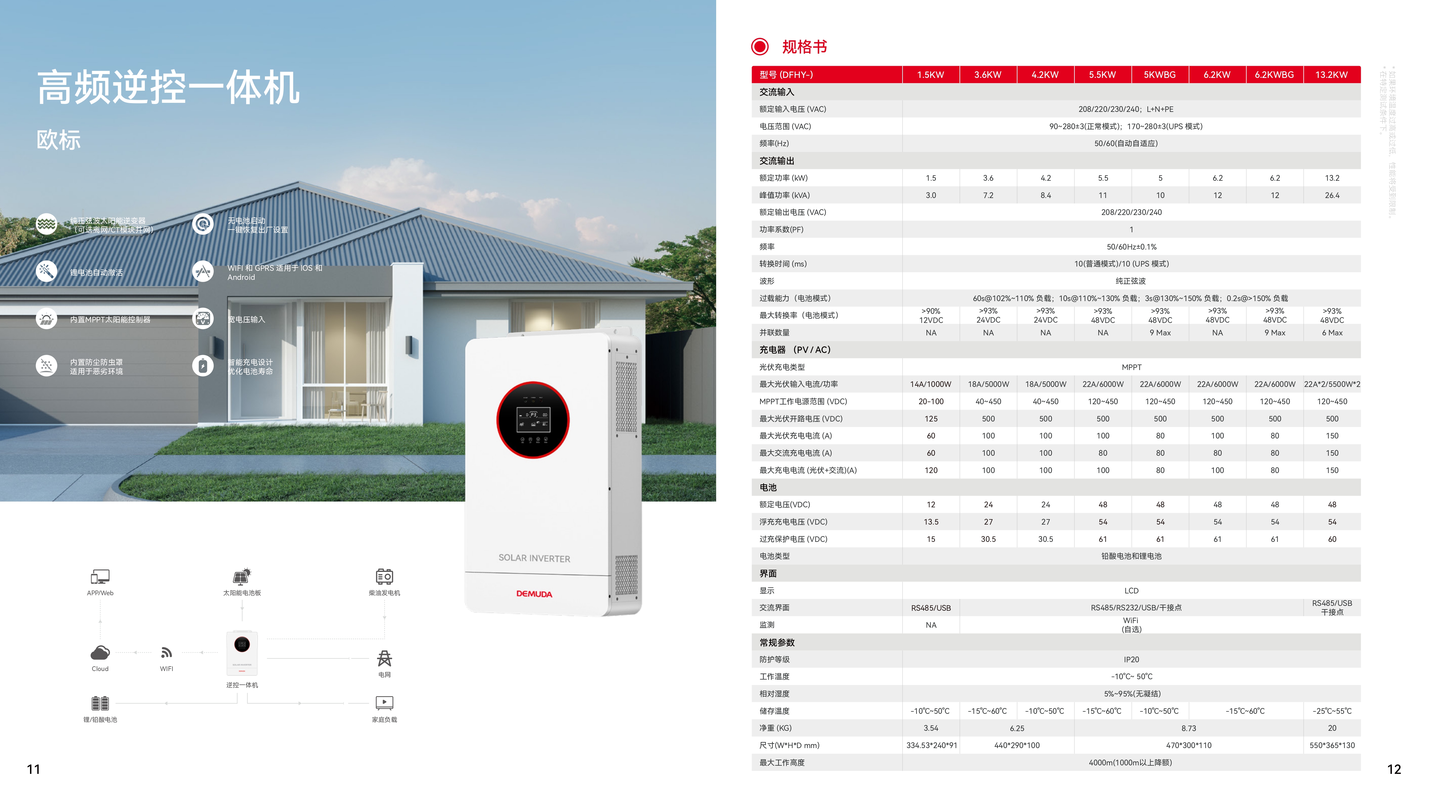 这是一款多功能太阳能逆变器,集MPPT太阳能充电控制器、高频纯正弦波逆变器及UPS功能模块于一体,适用于离网备用电源及自用场景。该逆变器可带电池或无电池运行。WiFi/GPRS模块为即插即用的监测设备,需安装于逆变器上,用户可随时随地通过手机或网站监控光伏系统的运行状态。