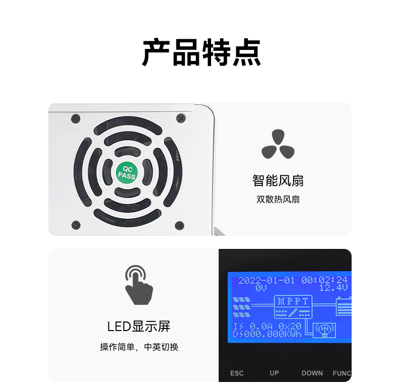 | 充电方式 | MPPT最大功率点跟踪、快速充电、恒压充电、浮充 | ||||||