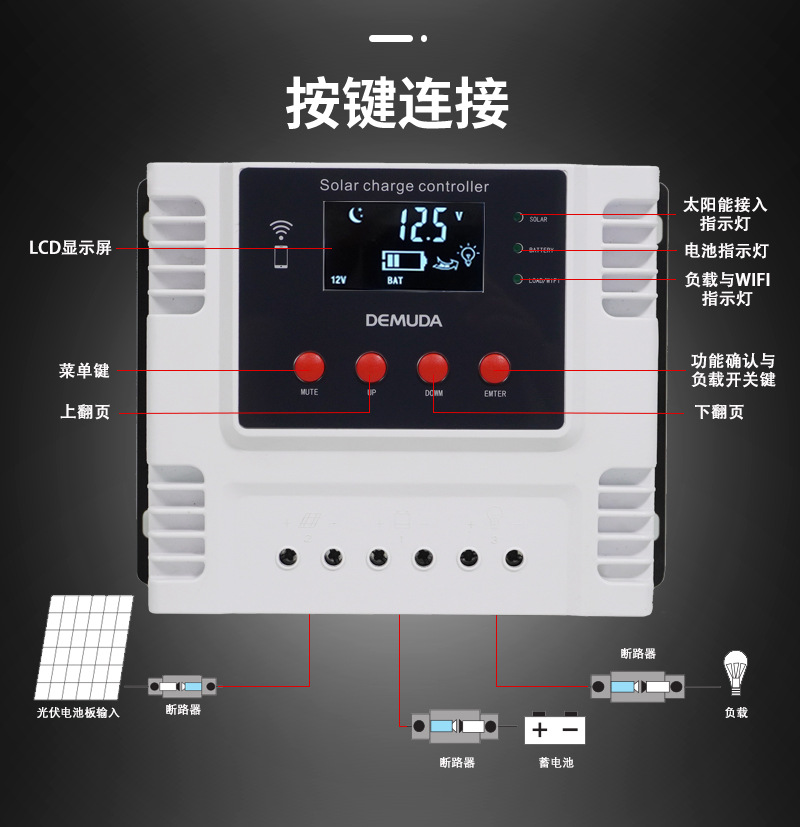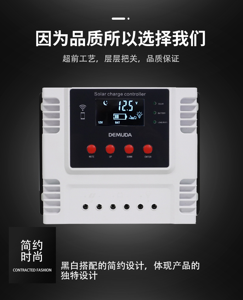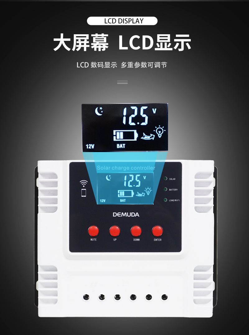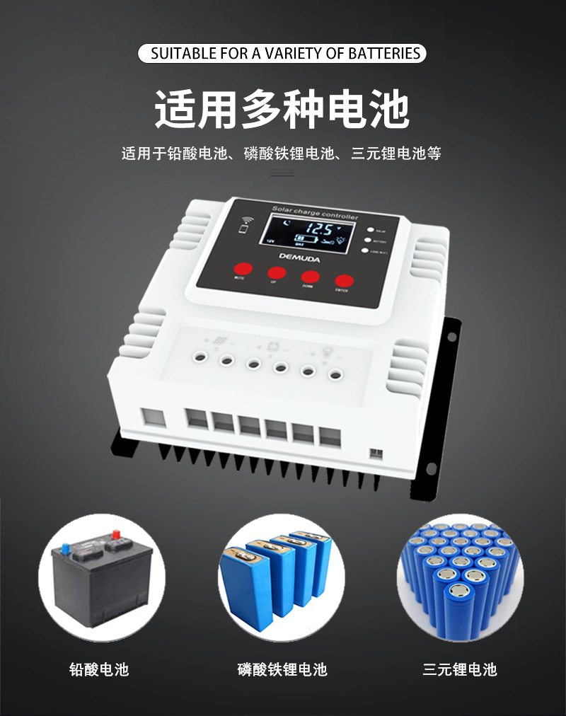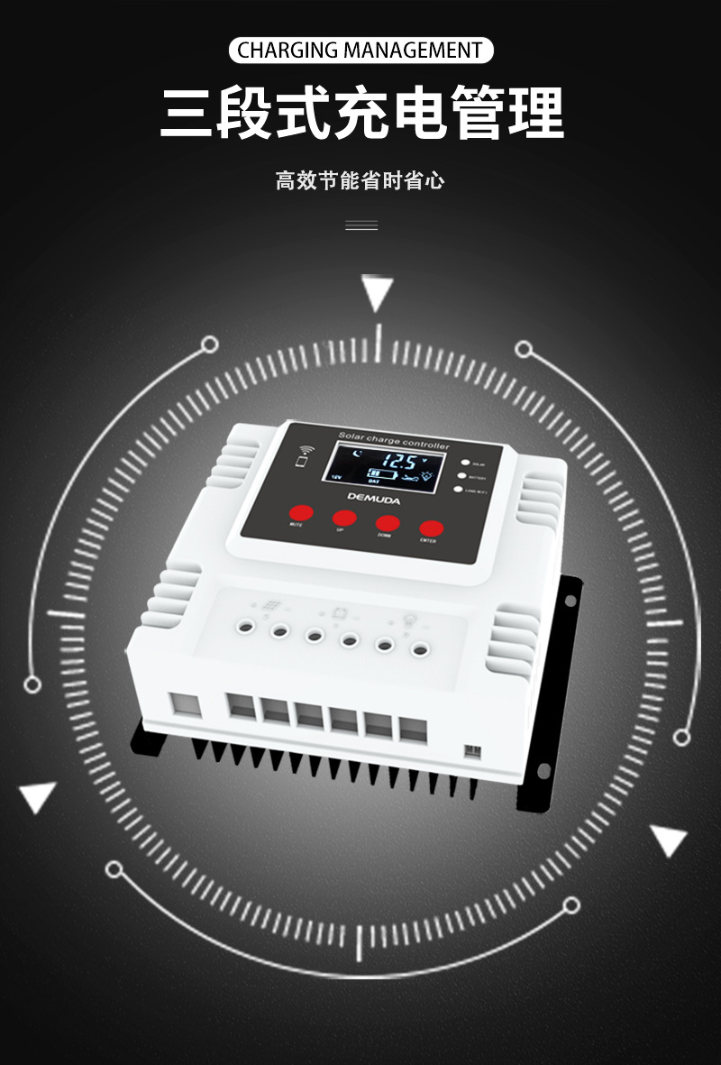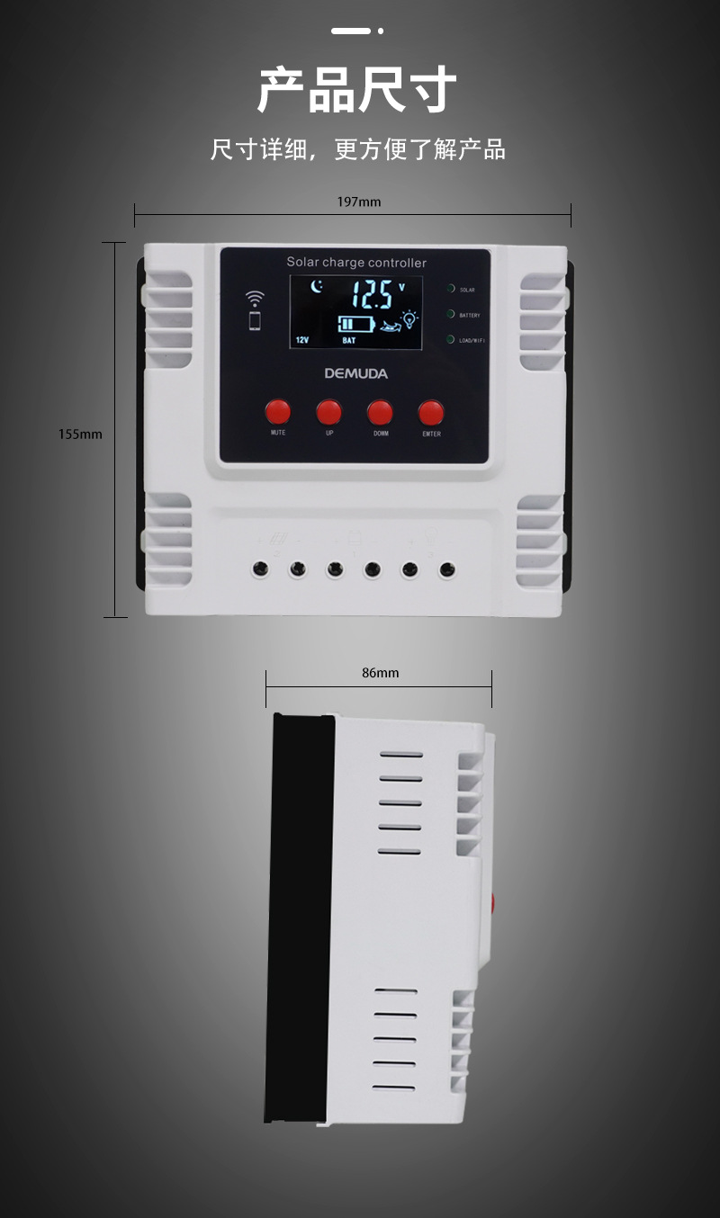 易于使用:配有LCD显示屏,可以清楚地显示状态和数据,可以方便地切换模式和参数配置。适用于带太阳能电池板的非干旱太阳能系统。用于家庭、工业。商用、露营房车等。