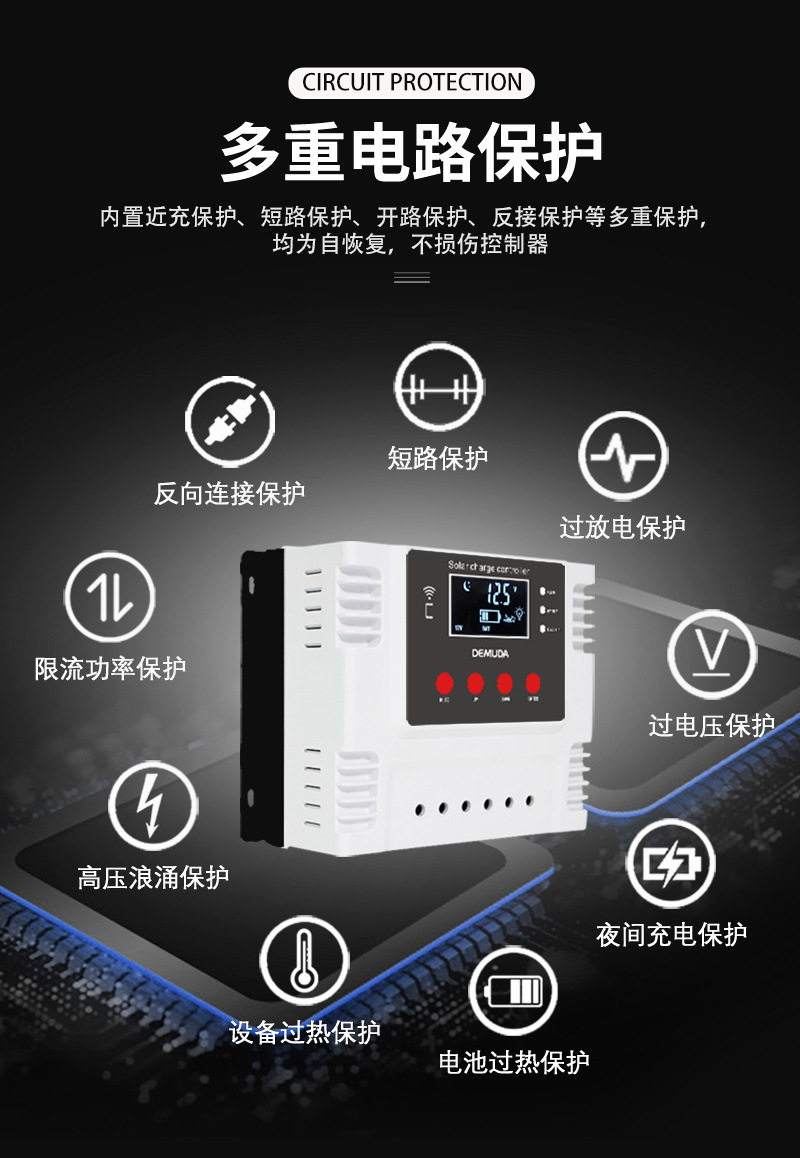 多重电气保护:过电流和短路保护、反接保护、低电压和过充电保护、过载和过充保护