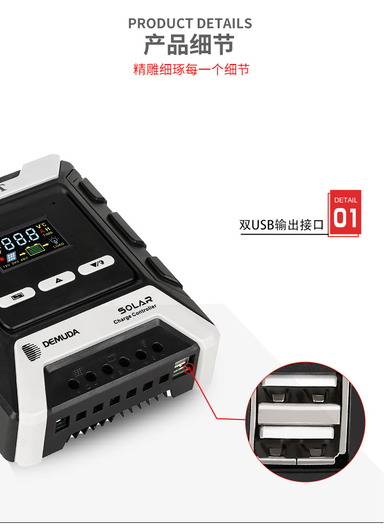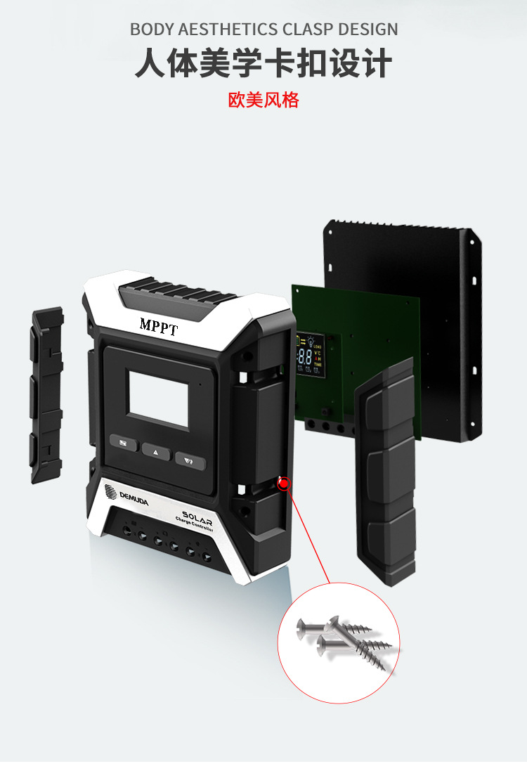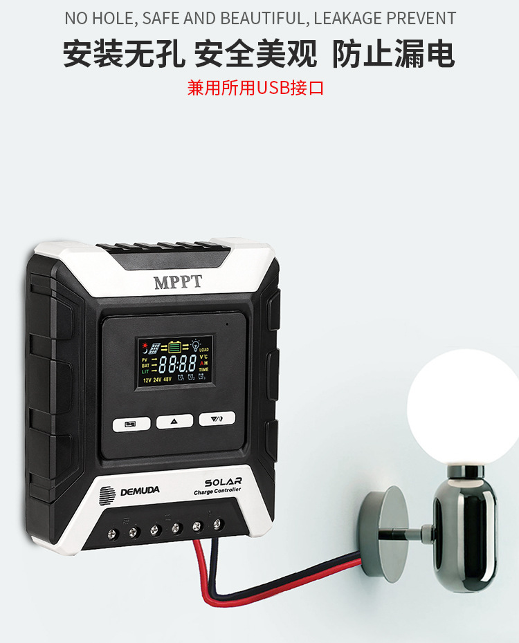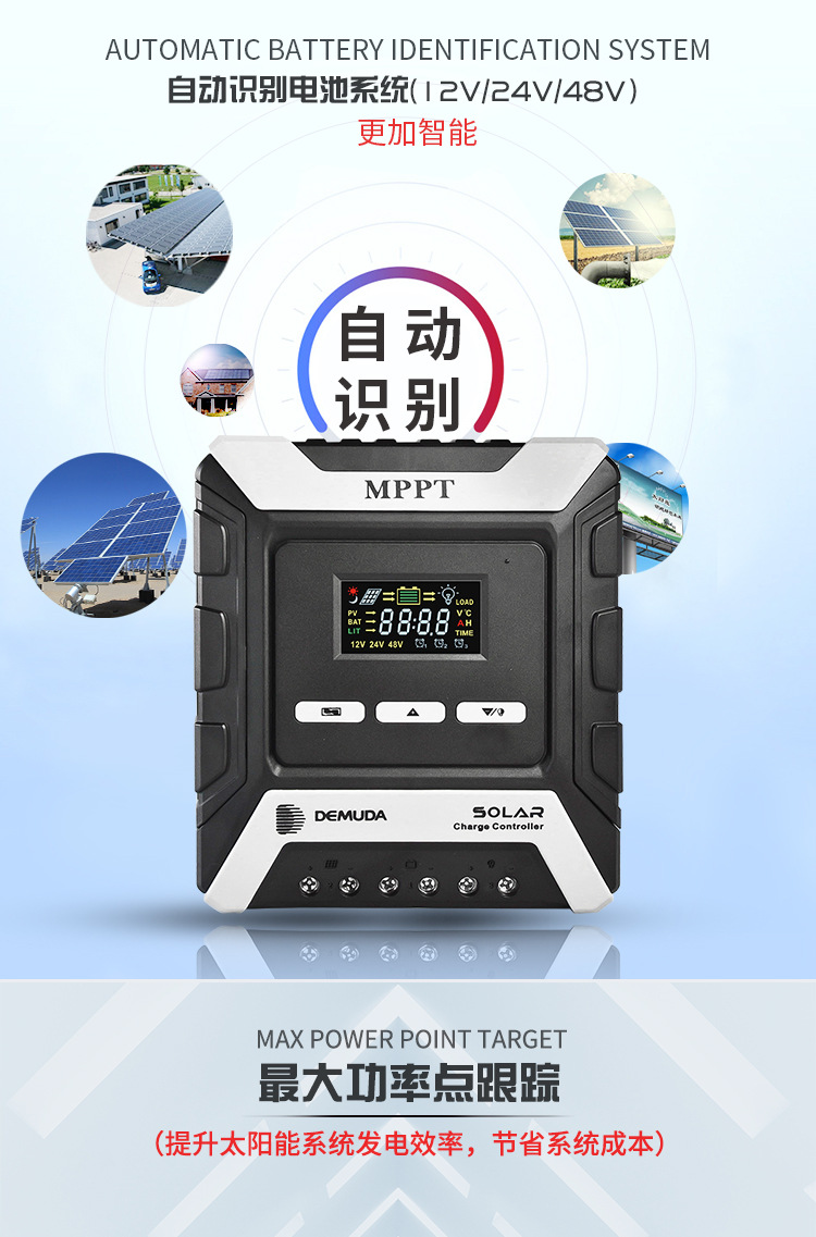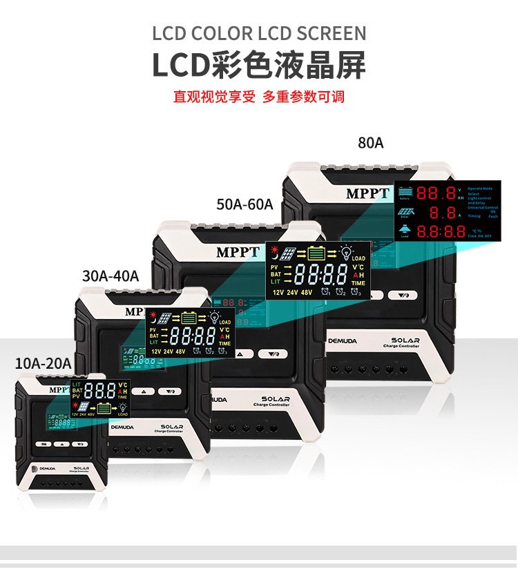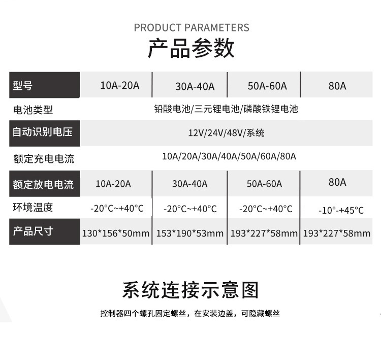 控制器电流规格涵盖 10A、20A、30A、40A、50A、60A、80A,48V 系统最大光伏输入功率达 1920-3840W,广泛适用于家用太阳能系统。
