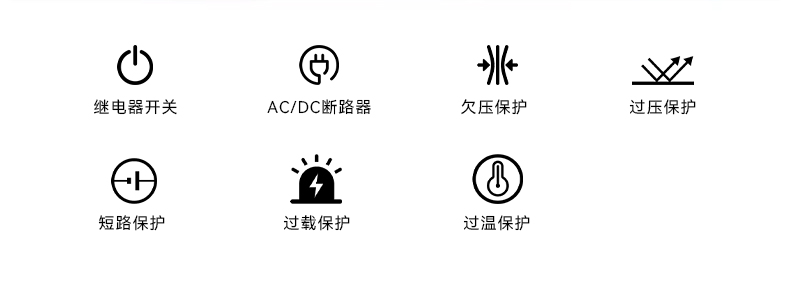| 保护措施 | 电池电量低、过度充电、过载、过热。 | ||||||||