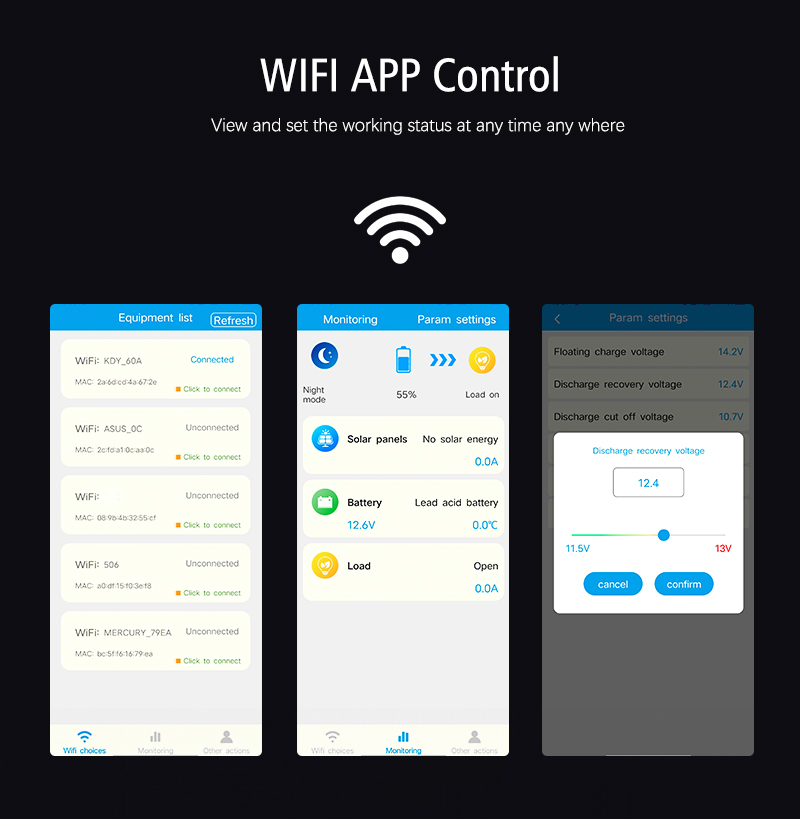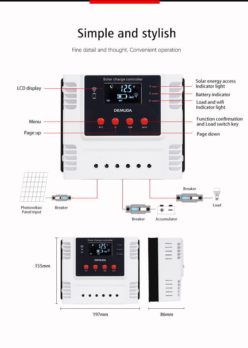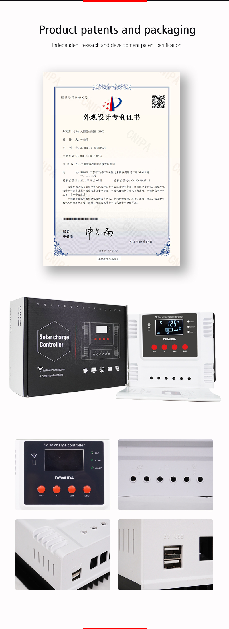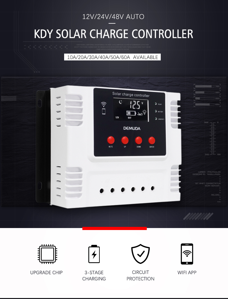 KDY is a PWM type solar charging controller with multiple rated currents ranging from 10A-60A. It is compatible with 12V/24V/48V automatic switching systems and supports lead-acid, ternary lithium, and lithium iron phosphate batteries. Equipped with WiFi APP remote control function (only supports Android), it can view and set work status at any time, and is easy to operate with an LCD display screen. Equipped with dual USB 5V/2A outputs, suitable for various off grid solar energy system scenarios such as home, industrial, camping RV, yacht, etc. The product has passed ROHS, CE and other certifications, with design patents and a one-year warranty. It has stable performance and is widely applicable in various scenarios.