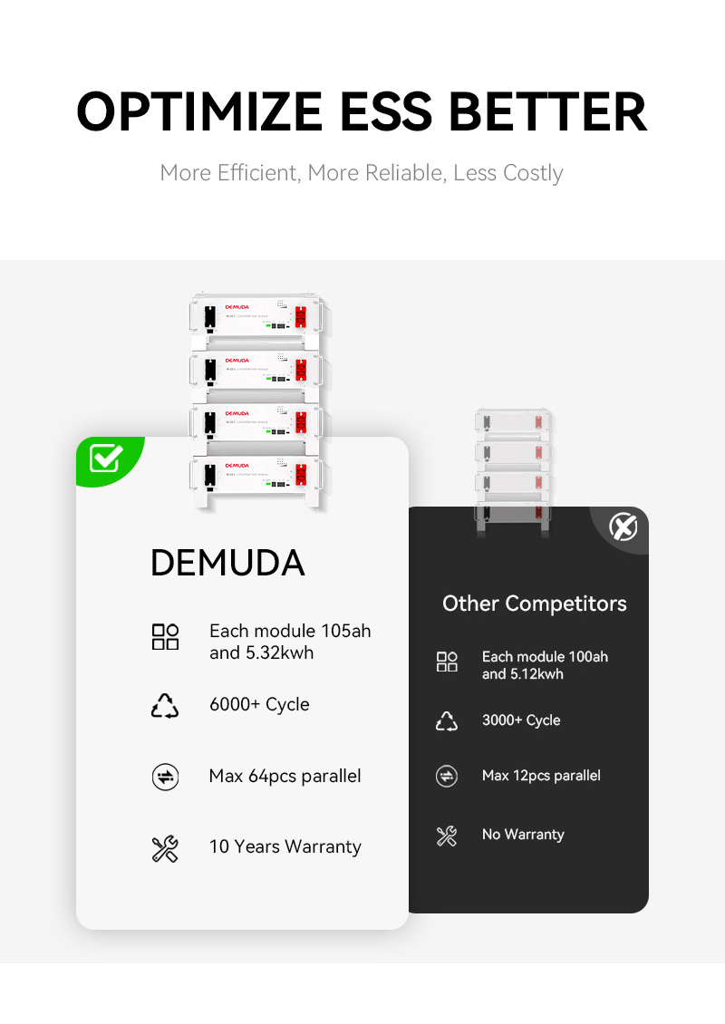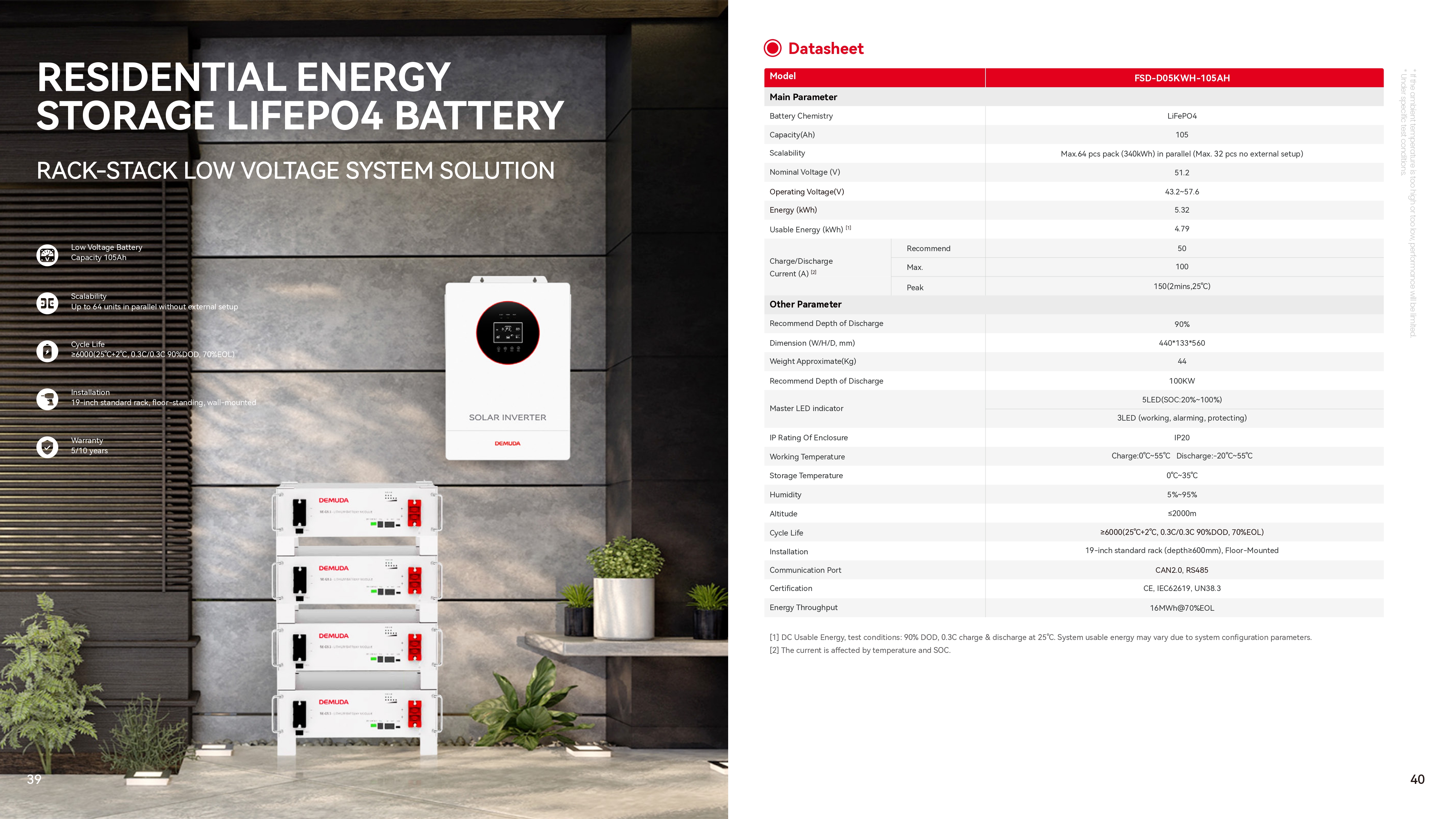 This lithium iron phosphate battery is one of new energy storage products developed andproduced by DEMUDA, it can be used to support reliable power for various types of equipmentand systems.