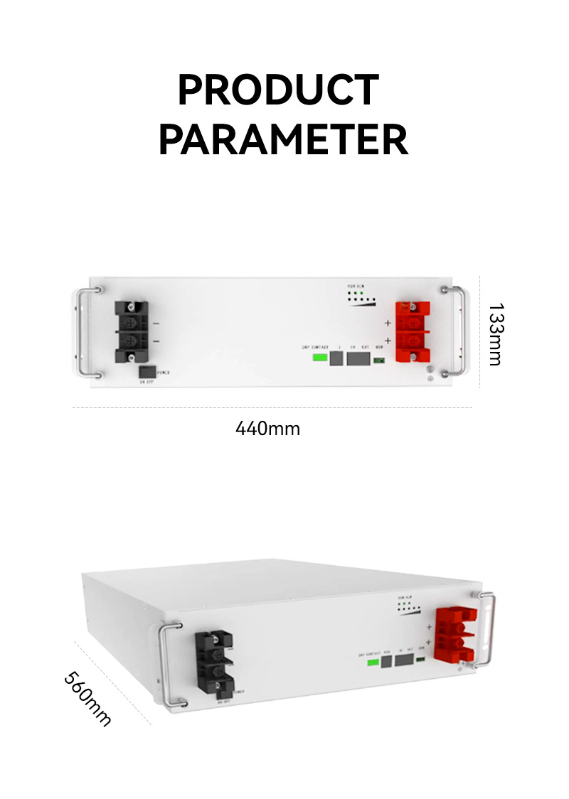 This battery is especially suitable for application scene of high power, limited installationspace and long cycle life.This battery has buit-in BS battery management system, which can manage and monitorcells information including voltage, current and temperature. What's more, BMS can balancecells charging and discharging to extend cycle life.64 pcs batteries pack can connect in parallel for larger capacity and longer power supporting duration requirements