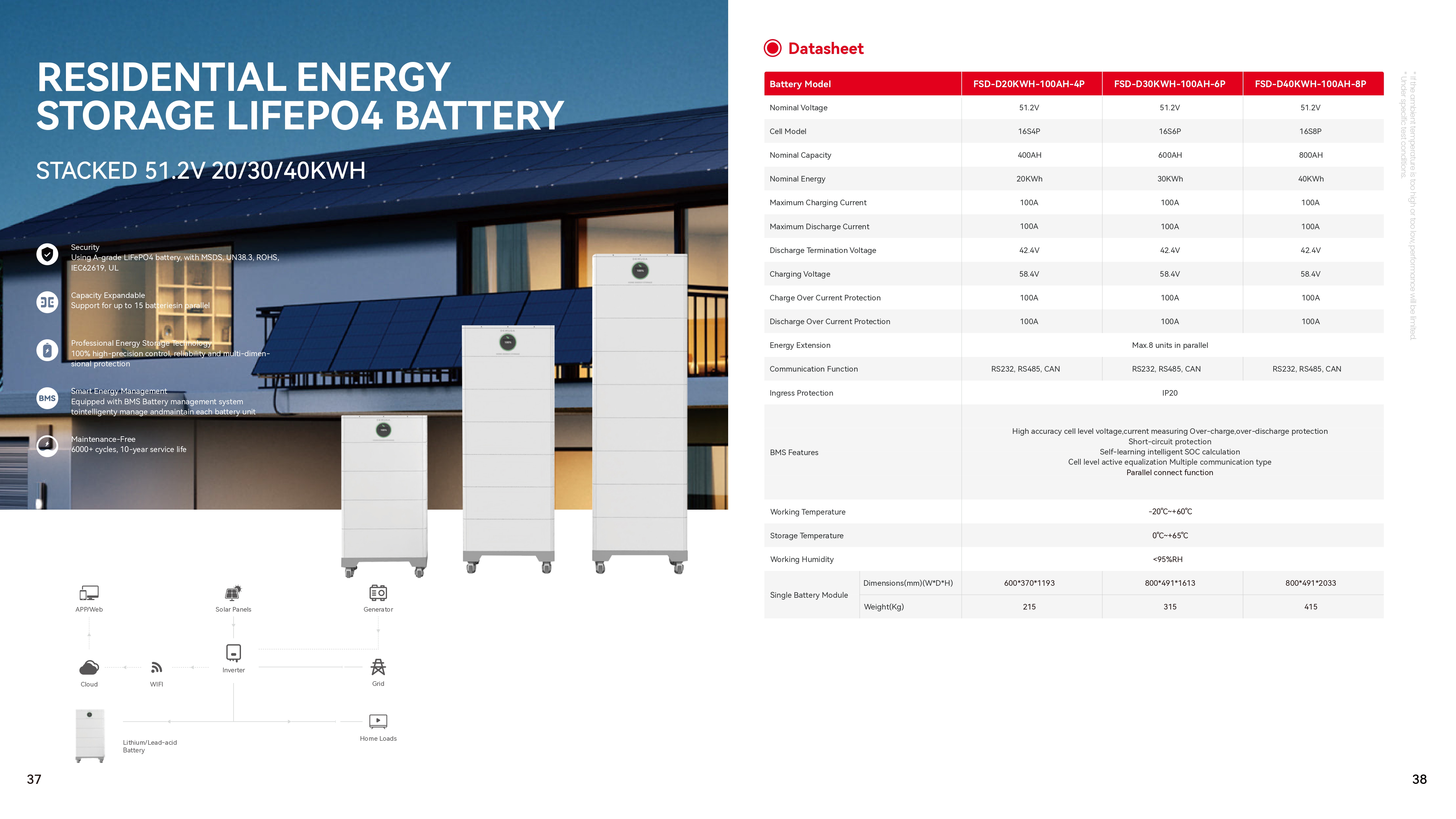 DEMUDA stacked battery is the perfect match and highlight of DEMUDA's one-stop energy storage solution, featuring an A-grade LFP Cell that offers a wide capacity range from 5kWh to 40kWh. Reliable lithium iron phosphate (LFP) battery technology ensures maximum safety and longer lifespan. In addition, the battery can also be compatible with various inverters.