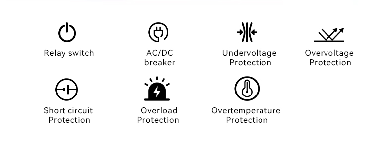 | Over-Load Protection | 110% <load<150%, beeps 0.5s every 1s, and Fault after 60s off the output, Load>150%, beeps 0.5s every 1s, and Fault after 20s. | ||||||||